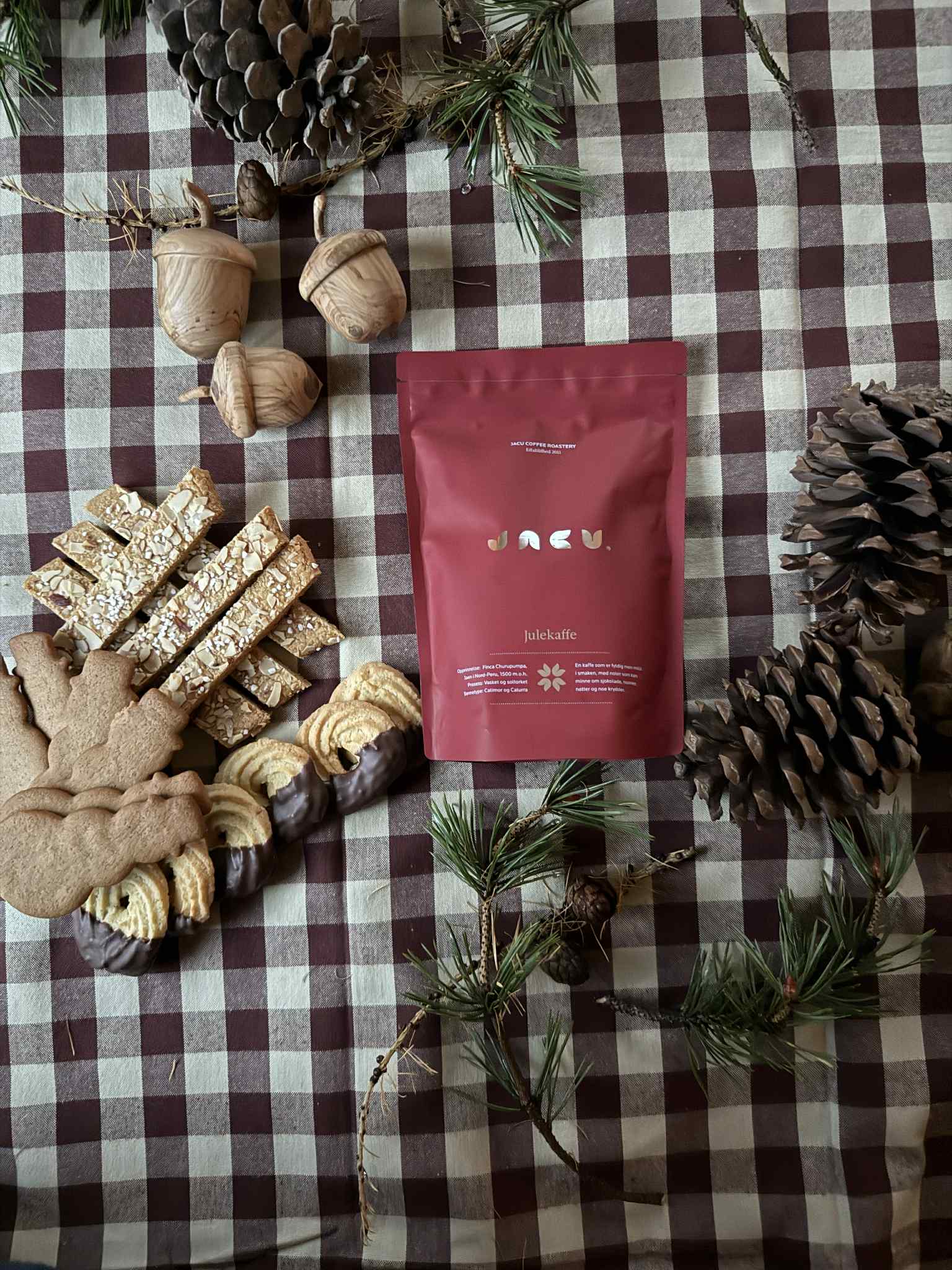 Deilig julekaffe fra Jacu og poser med julekaker pakket inn som en lekker gave. Dette er gaven for den som liker sikkelig god kaffe med høy kvalitet, og som synes en julekake er perfekt å dyppe oppi koppen.